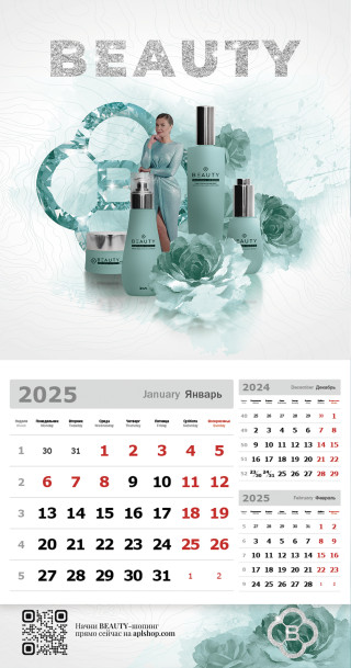 Компактный, информативный календарь-домик на 2025 год готов занять место на вашем столе. На календаре размещены основные QR-коды на официальные страницы Компании и бренда BEAUTY в соцсетях, а также полезная информацию о достижении квалификаций в Компании